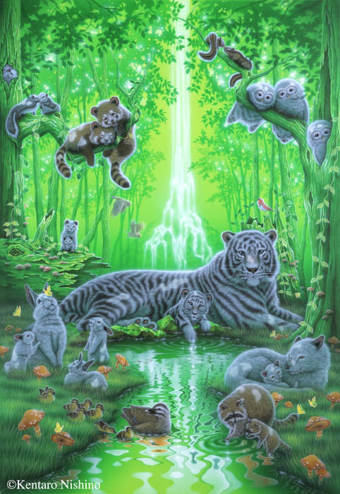 「マザーツリー」(シマリス、ヒグマ、フクロウ、レッサーパンダ、エゾシカ、ウサギ、カメ、ハクチョウ、キツネ、ホワイトタイガー、タヌキ、カルガモ) 65.2 × 100.0cm、アクリル、キャンバス、2012年作